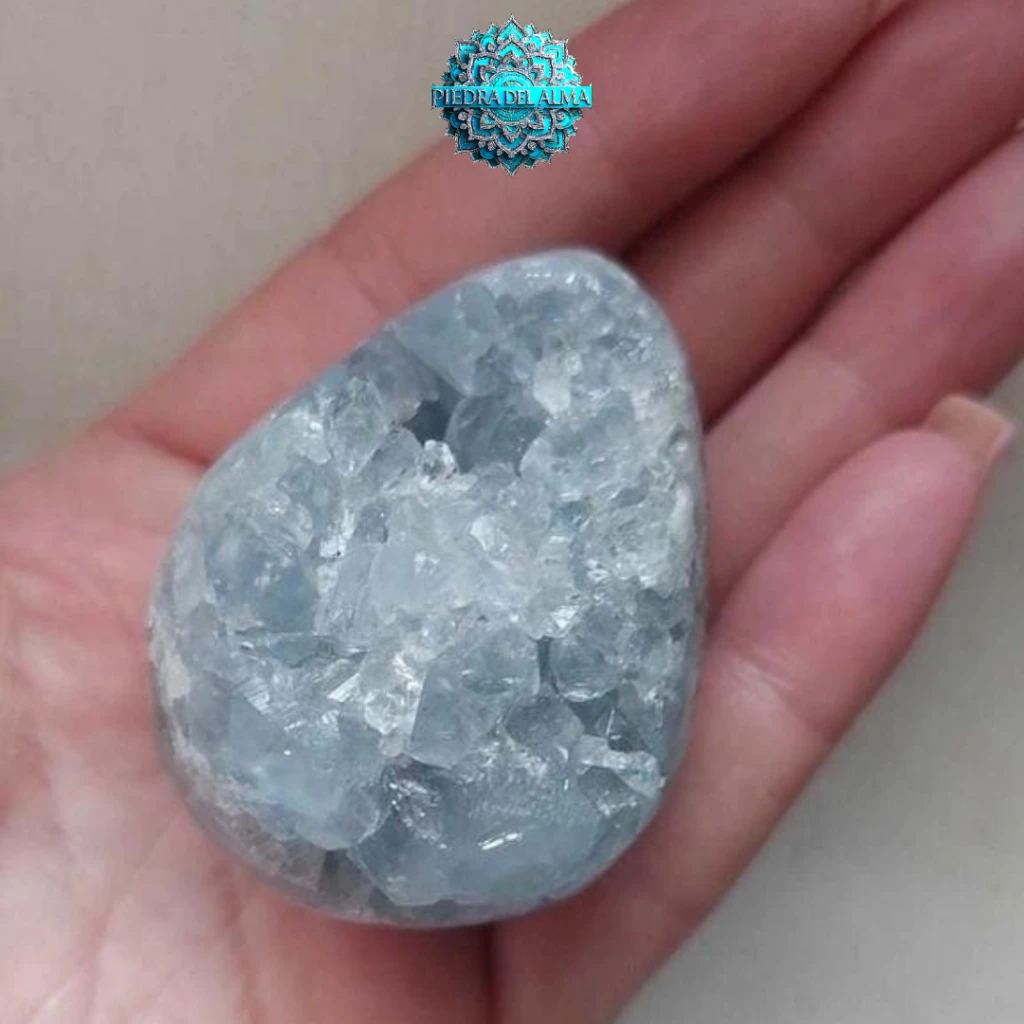 Piedra natural de Celestina con forma de Huevo en drusa, medidas 5.5 cm de alto y 4 cm de ancho.