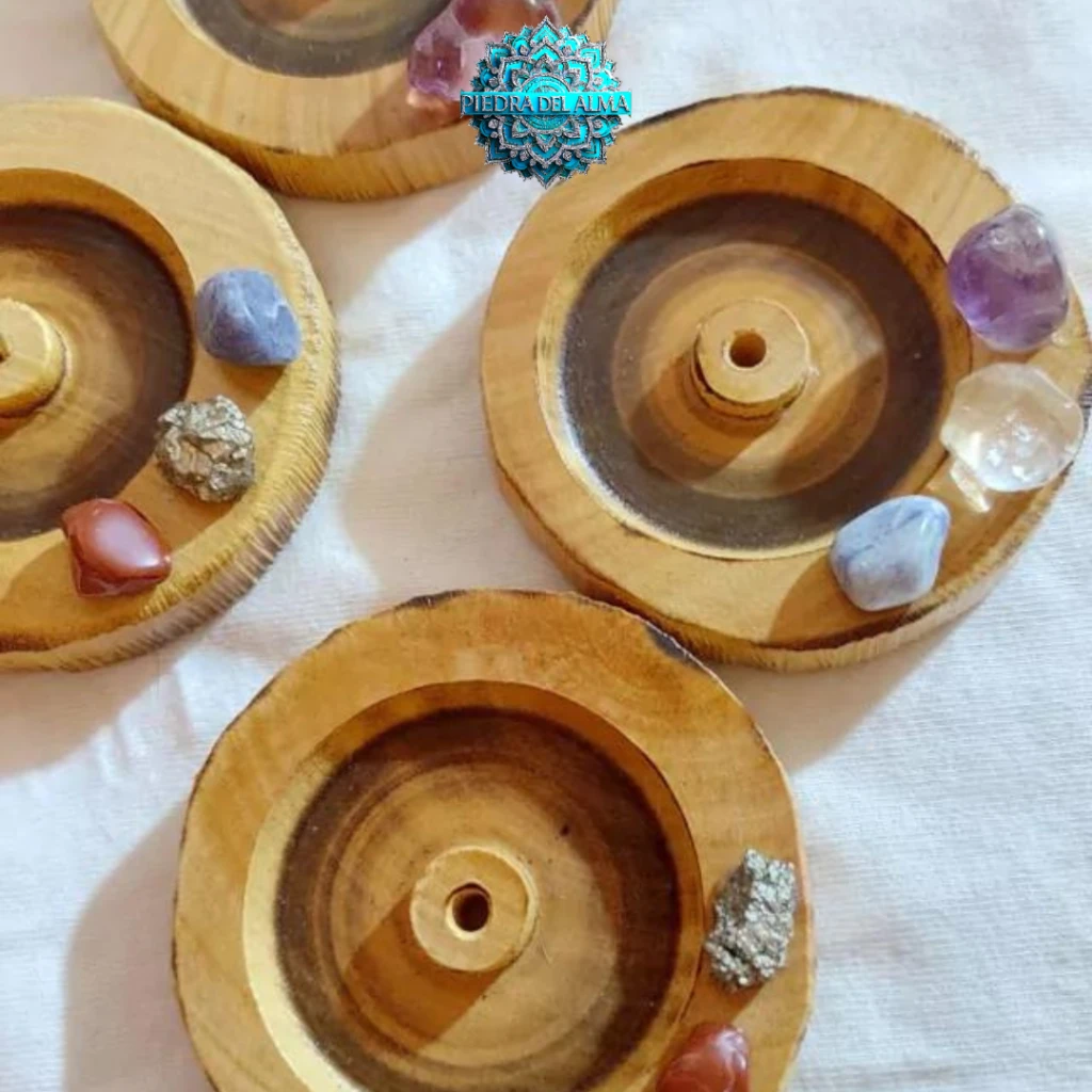 Porta sahumerio de madera con piedras semipreciosas roladas. Medidas de 6 cm.